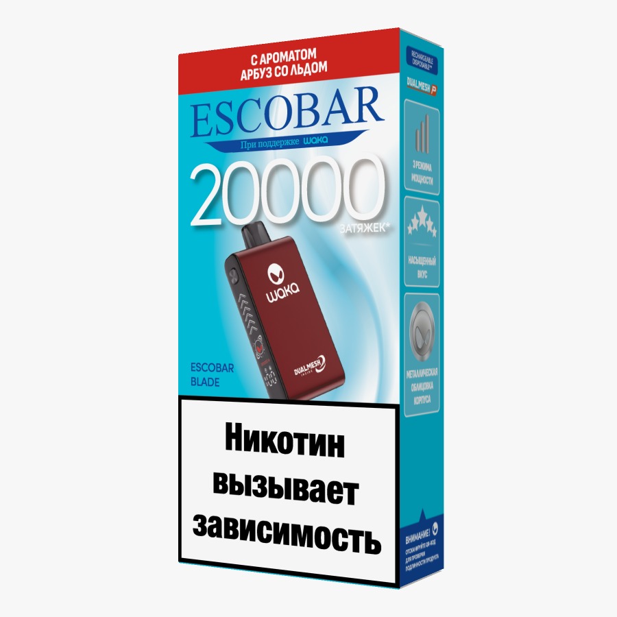 Escobar, Escobar Blade 20000, ОдноразовыеОдноразовая электронная сигарета ESCOBAR Blade рассчитана на 20000 тяг. Девайс имеет прочный корпус, выполненный из сплава алюминия. Работает в трёх режимах мощности: Boost, Smooth, Eco. На торце устройства расположен дисплей с динамической подсветкой, меняющейся с каждой затяжкой, и информация о выбранном режиме, уровне заряда и жидкости. Встроенный АКБ имеет ёмкость 700 mAh.